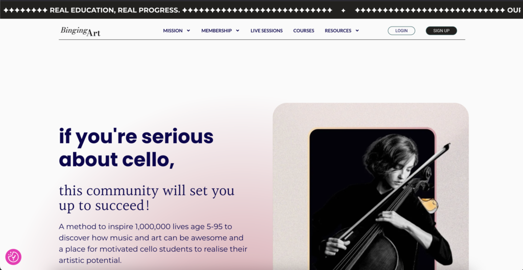 In ’25 I co-coded a platform for my students: Binging Art Academy. The Binging Art principle is to enhance mental health through learning cello playing. By fostering collaboration, mindful knowledge of practicing like-a-pro, and community, the Binging Art method of teaching supports a global network of a new generation of strong, mentally and physically healthy cellists, and shares Joasia’s expertise with musicians at all levels worldwide.