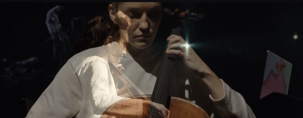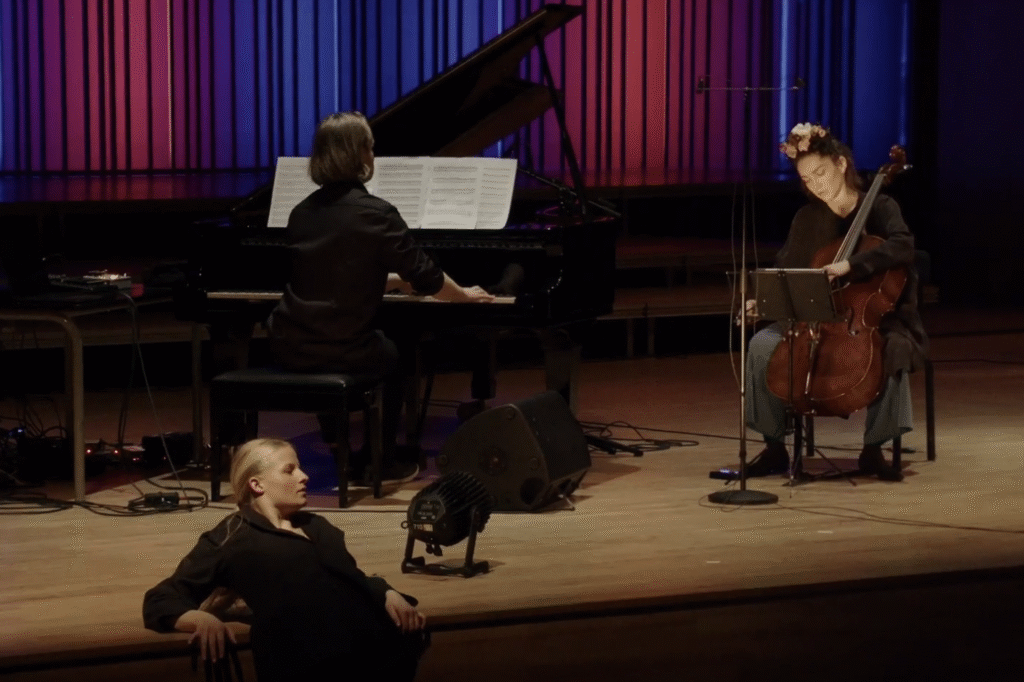If you are still reading (thanks!), listen below to how, in these performances – on a soloist concerts, I played some of my compositions on main stage of Aarhus Musikhuset. Played here cello, while I did live electronics and triggered visuals (designed by Jonathan Snapir). And then – I played new, commissioned music. Concert started in pitch black, and even though you can’t ‘see’ me during the first three pieces on vid – trust me, I am sitting there alone, behind a thin canvas on which I triggered visualisations, and played at the same time – with tech and on cello.